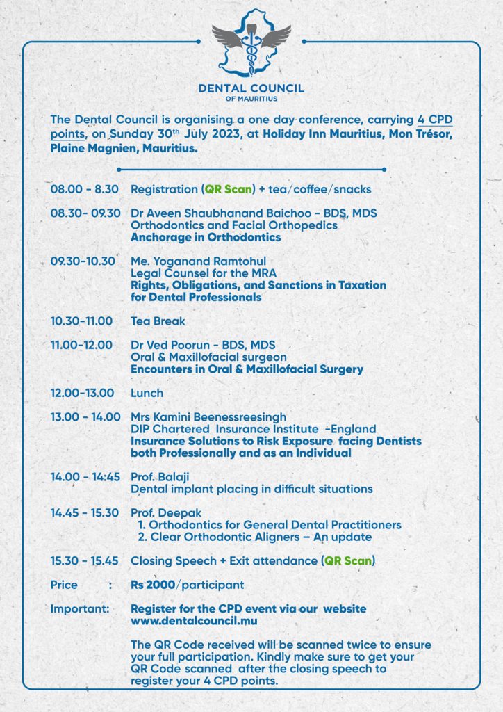 The Dental Council of Mauritius is organising its next CPD event on Sunday 30th July 2023 awarding 4 CPD credit points. Registration will be open as from Monday 03rd July at 20.00hrs and a fee of Rs 2000 is applicable.